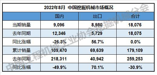 2022年8月挖掘機國內市場銷量9096臺,同比下降26.3%