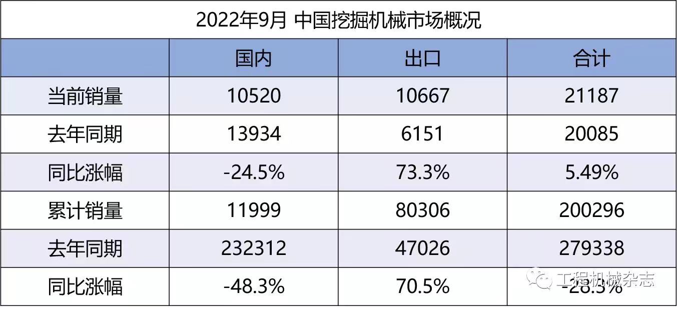 2022年9月銷售挖掘機21187臺,同比增長5.49%,連續3月企穩回升